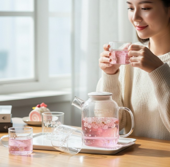 Set ceainic+4 cesti de sticla, suport porcelan SJ4001-6