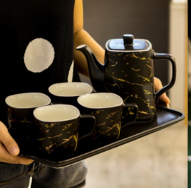 Set ceainic+4 cesti de portelan, suport din lemn SJ1496-2